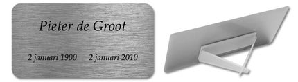 Op de naamplaat worden de namen en de data van de overledene gedrukt.